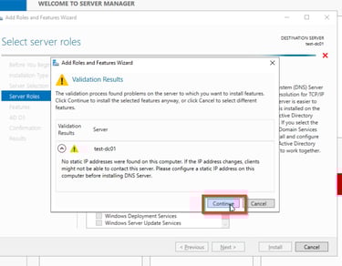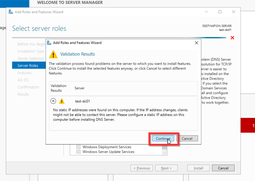Hier werdet ihr gewarnt, dass für eueren Server keine statische IP-Adresse eingerichtet ist. Das ist für meinen Test-Server nicht weiter schlimm. Ihr solltet aber aufjeden Fall eine statische IP-Adresse setzen, entweder direkt auf dem Windows Server in dem dazugehörigen Netzwerkadapter oder auf eurem Router.