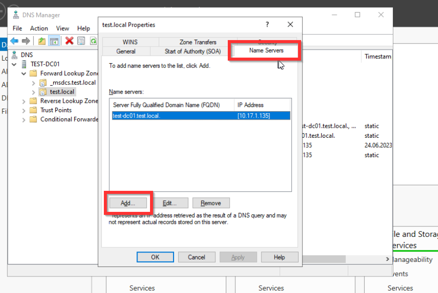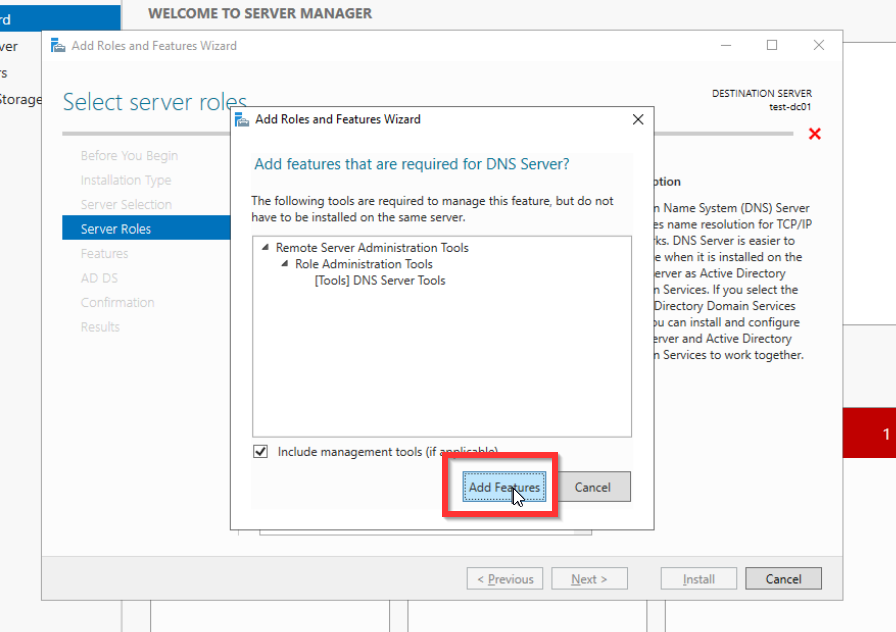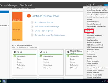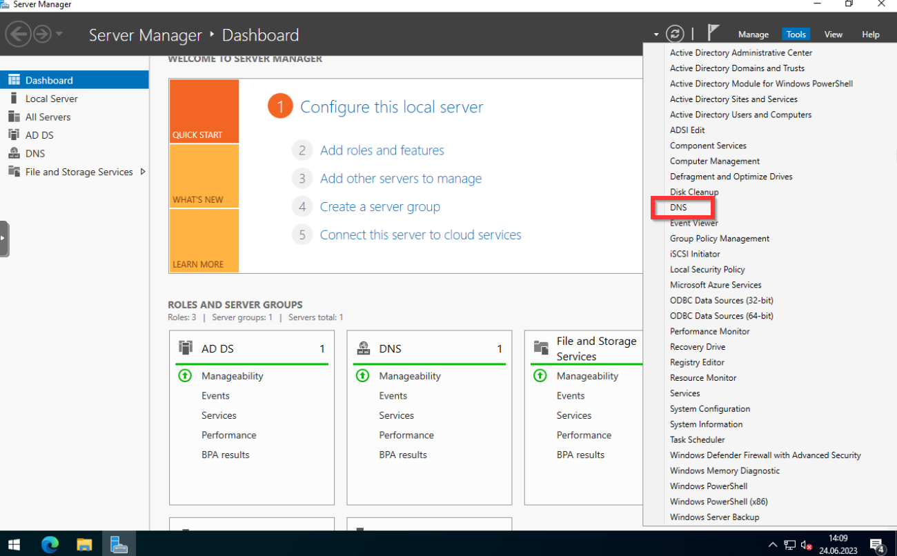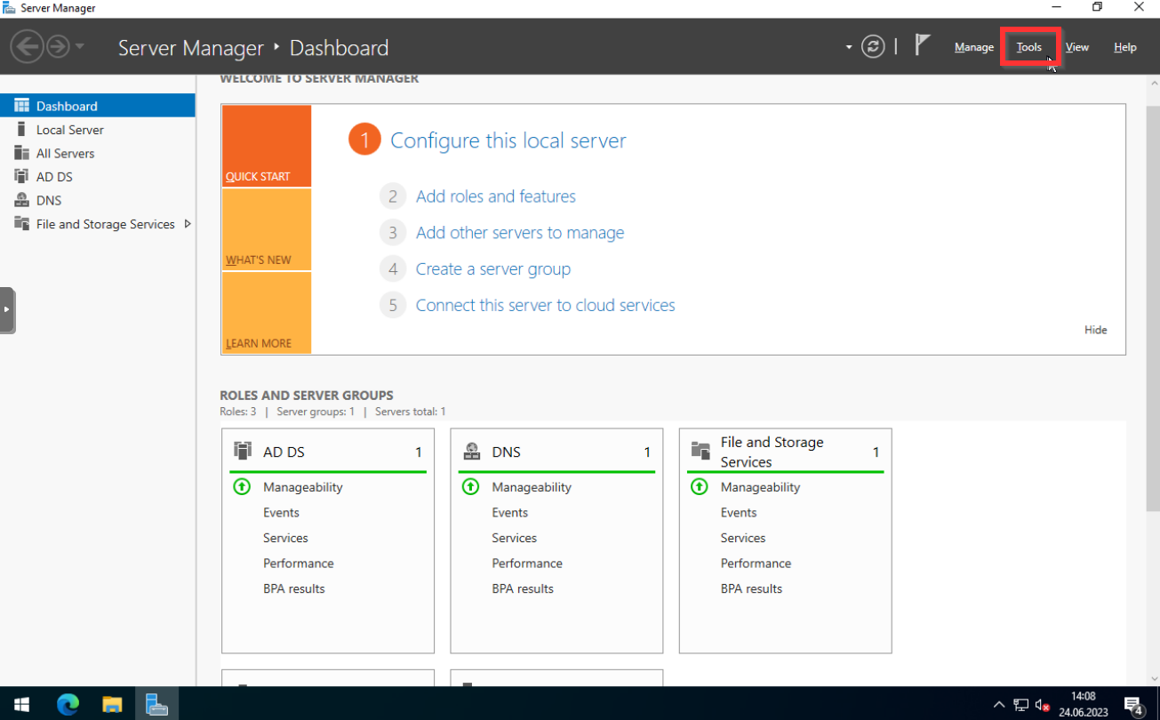 Sehr schön! Wir haben erfolgreich den AD Service konfiguriert und unseren ersten Domaincontroller erstellt. Der nächste Schritt bevor wir andere Systeme in die Domäne heben können, bzw. mit der Domäne zu verbinden um diese zentral zu verwalten, müssen wir noch den DNS Service konfigurieren. Alle Services können wir unter dem Tab Tools erreichen.