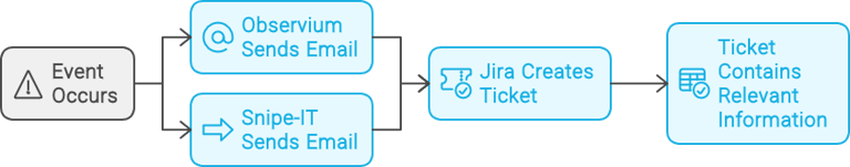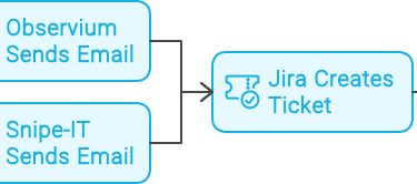Das Ticketsystem basiert auf der nahtlosen Integration von Observium und Snipe-IT mit Jira. Wenn ein Ereignis wie ein Hardwareausfall, Netzwerkproblem oder ein niedriger Bestand an Assets auftritt, senden Observium und Snipe-IT automatisch E-Mails an eine spezifische E-Mail-Adresse.